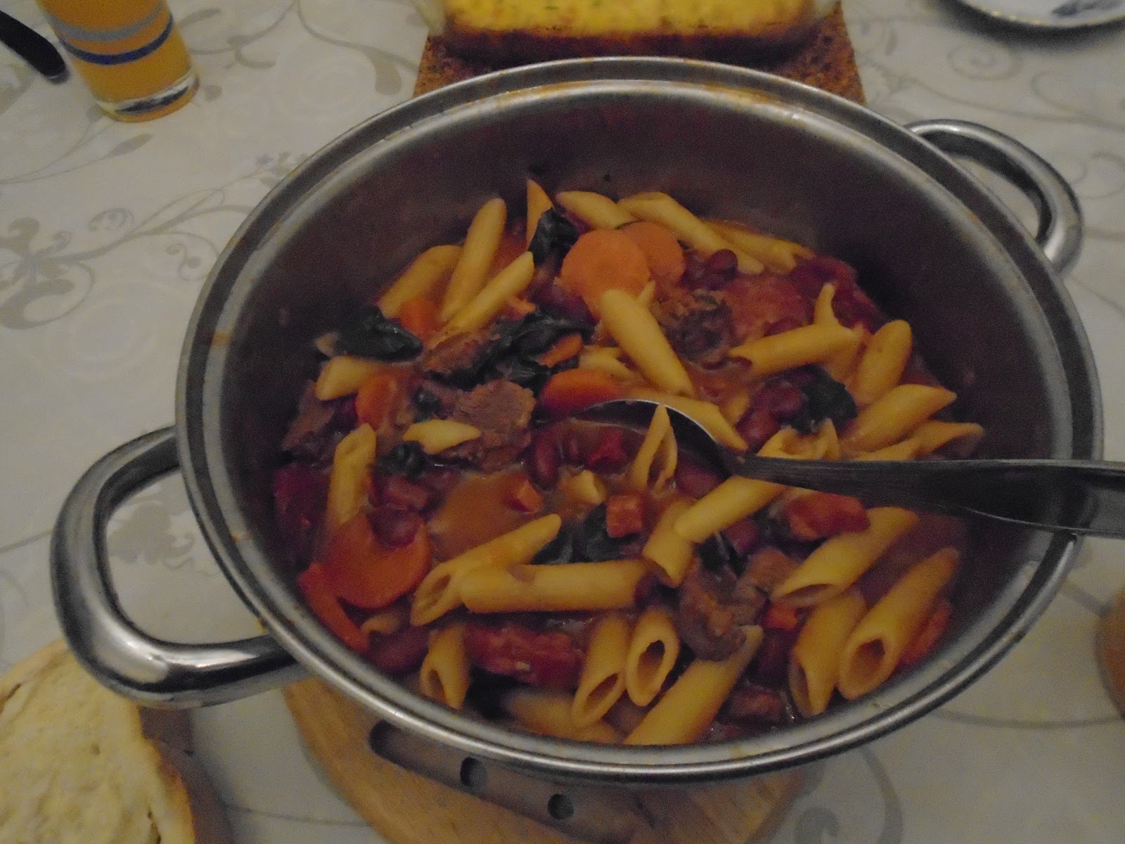 - Cebola e alho picados com azeite, pedacinhos de bacon, salpicão, chouriço, carne de vaca, cenoura, vinho branco, tomate triturado, folha de louro, sal, pimenta, feijão e água em que ele cozeu, depois juntar massa,